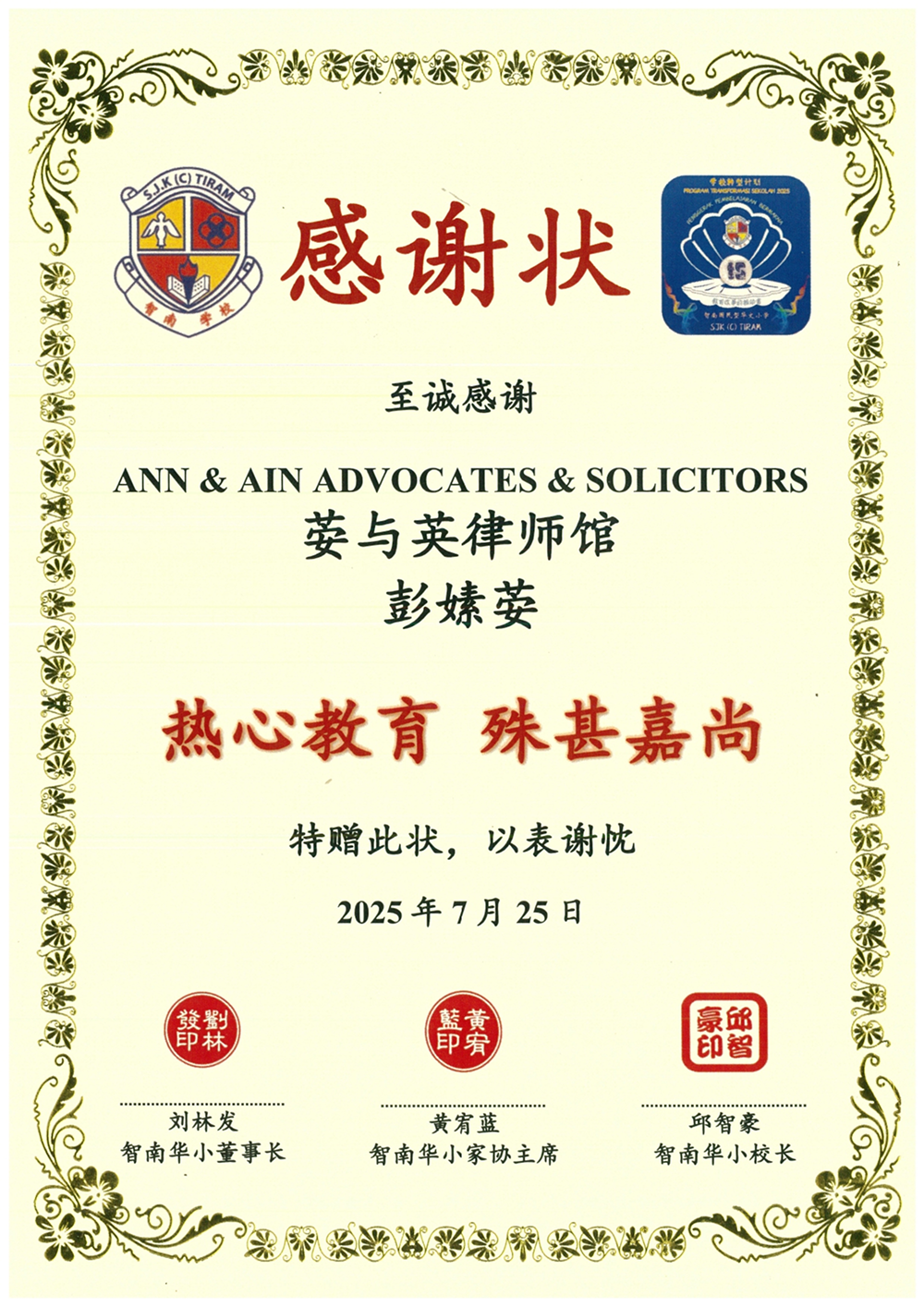 荌与英律师事务所很荣幸于 2025 年 8 月 22 日获得 新廊国民型华文小学 颁发的 感谢状。