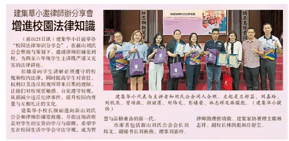建集华小(SJKC Chien Chi, Masai)日前在新山刘氏公会的赞助与策划下,成功举办了“校园法律知识分享会”。本所律师彭嫊荌受邀到校,为四至六年级学生主讲一场既严谨又充实的法律讲座。
